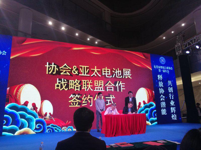 廣州碩信展覽有限公司總經(jīng)理曹成就“亞太電池展與東莞市鋰電行業(yè)協(xié)會戰(zhàn)略合作思路”做了詳細介紹。在協(xié)會秘書處的安排下,由協(xié)會名譽會長東莞市宏澤機電工程有限公司徐豐彩教授、協(xié)會會長/東莞振華能源科技有限公司董事長李樹軍為見證,協(xié)會秘書長/東莞市科銳機電設(shè)備有限公司董事長許剛、廣州碩信展覽有限公司總經(jīng)理曹成分別代表東莞鋰電行業(yè)協(xié)會與亞太電池展舉行了隆重的戰(zhàn)略聯(lián)盟合作協(xié)議簽約儀式!現(xiàn)場數(shù)百位東莞鋰電同仁共同見證了這一歷史時刻!