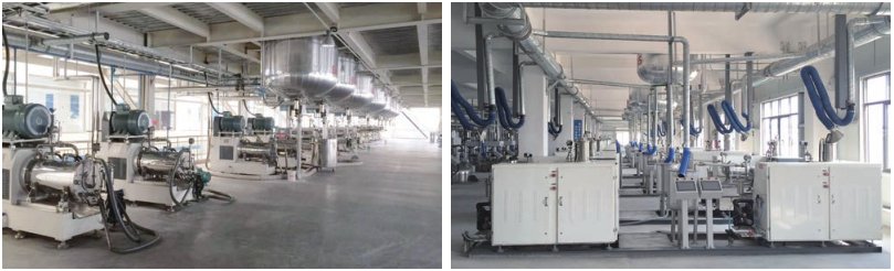 采用循環(huán)研磨工藝,環(huán)保節(jié)能、勞動強度小。配制好的原始漿料,經(jīng)過第一遍粗略研磨后,泵入循環(huán)攪拌罐,經(jīng)底部泵輸送進入納米研磨機;一邊經(jīng)過研磨后送入循環(huán)罐,與未曾研磨過的物料通過攪拌機快速混亂,一邊又通過底部泵入砂磨機,周而復始直到達成研磨要求。一般而言,罐的容積是砂磨機流量的1/4。