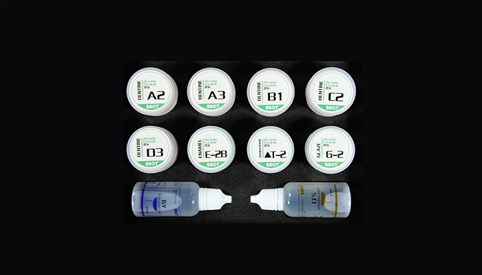 樣品試驗套裝包括牙本質(zhì)瓷 (5g) A2/A3/B1/C2/D3 ,半透明瓷 (5g) E-2B,透明瓷 (5g) T-2 ,釉粉 (3g) G-2 ,體瓷專用液 (15ml) C.F.S ,釉液 (15ml) G.Y。