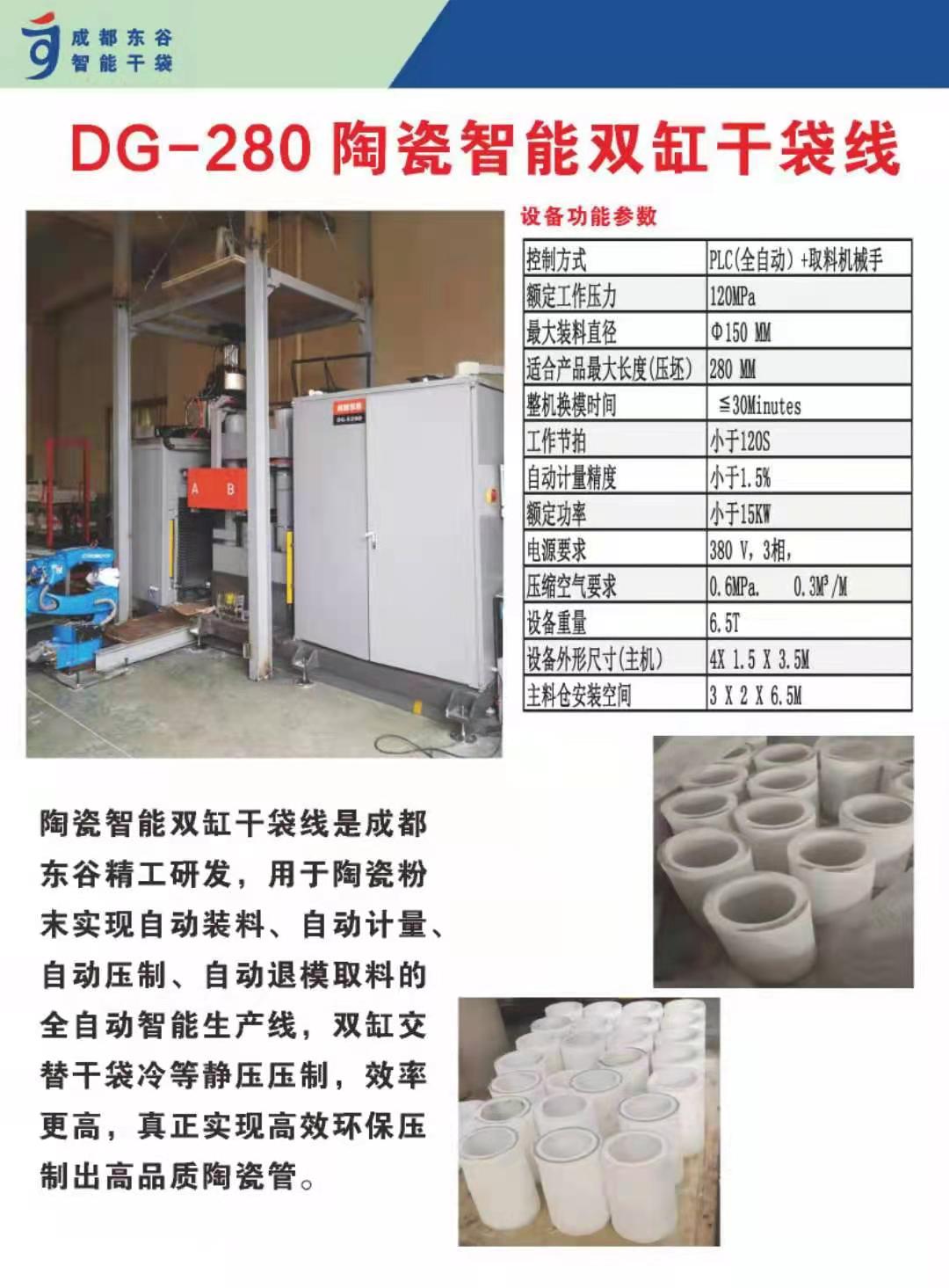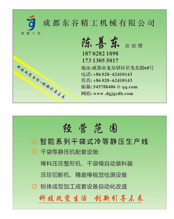 成都東谷精工機械有限公司是依托高端航天技術、專業從事智 能干袋式冷等靜壓技術研發及裝備制造的高新技術企業。公司成立于2006年,獨家 擁有行業多項專利技術;聚集行業內優秀技術人才,成功解決了粉體干袋成型過程 中的效率低、材料利用率低、精度低等多項技術難題。 公司研發的大尺寸干袋壓機、多種智能干袋成型生產線、壓坯整形機、壓坯切 割機、自動計量裝料機等自動化裝備,采用智能控制系統,加工精度高、效率高、 材料利用率高。憑借領先的技術、過硬的質量、高效的服務,公司贏得了硬質合 金、粉末冶金、各類陶瓷、石墨、磁性材料等行業廣大朋友的信任與贊譽。 智能干袋—東谷精工,與您共創成功!