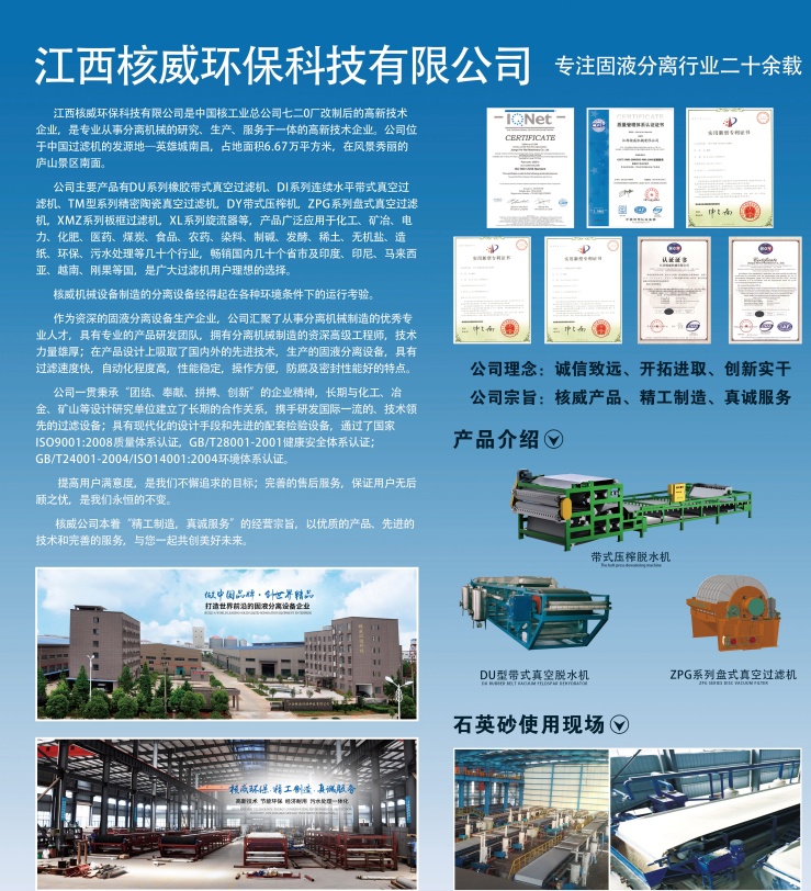 公司主要產品有DU系列橡膠帶式真空過濾機、DI系列連續水平帶式真空過濾機TM型系列精密陶瓷真空過濾機,DY帶式壓榨機,ZPG系列盤式真空過濾機,XMZ系列板框過濾機,XL系列旋流器等,產品廣泛應用于化工、礦冶、電力化肥、醫藥、煤炭、食品、農藥、染料、制堿、發酵、稀土、無機鹽、造紙、環保、污水處理等幾十個行業,暢銷國內幾十個省市及印度印尼、馬來西亞、越南、剛果等國,是廣大過濾機用戶理想的選擇。