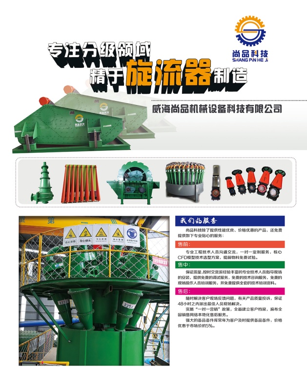 威海尚品機械設(shè)備科技有限公司位于山東省威海市高新技術(shù)產(chǎn)業(yè)開發(fā)區(qū),是一家專業(yè)從事機械設(shè)備設(shè)計、旋流器CFD模型新技術(shù)及新材料研發(fā)生產(chǎn)的民營科技型股份制企業(yè),產(chǎn)品包括礦山機械、流體機械(旋流器)、油田機械(注油頭)及新型耐磨耐腐材料等幾大類,覆蓋了冶金、礦山、機械、化工、油田、電力環(huán)保等領(lǐng)域。公司重視科技研發(fā),大力開展技術(shù)創(chuàng)新合作,并與國內(nèi)清華大學(xué)、北京航空航天大學(xué)、華東理工大學(xué)、四川大學(xué)、昆明理工大學(xué)、山東科技大學(xué)、哈爾濱工業(yè)大學(xué)等知名院校合作,榮獲多項發(fā)明專利和實用新型專利。公司以重視科技力量、產(chǎn)品質(zhì)量為己任,以精品設(shè)備,推陳出新,為客戶解決疑難雜癥為目的。