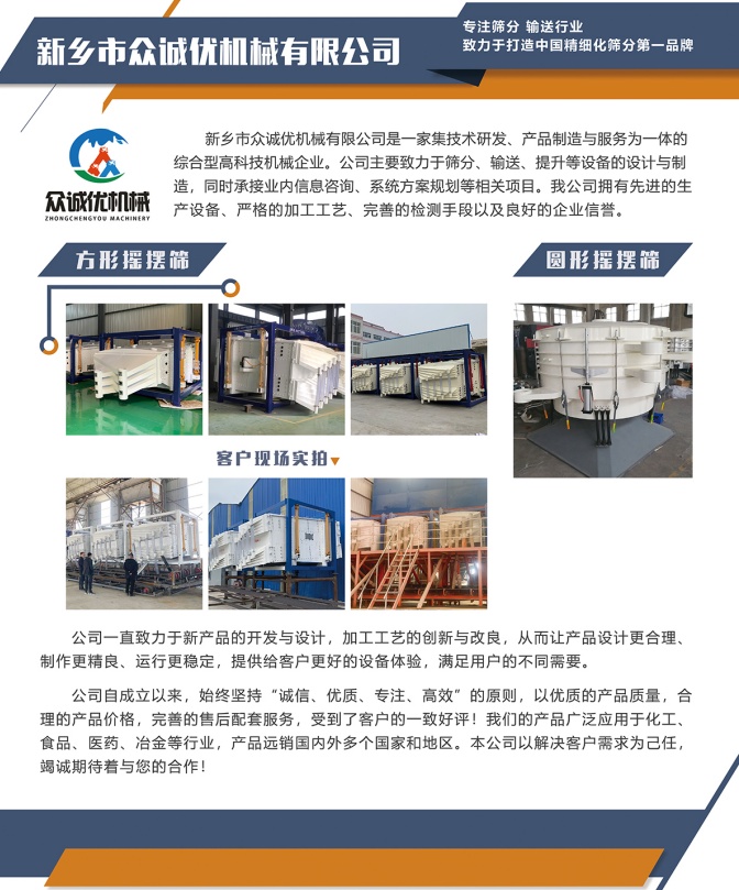 新鄉市眾誠優機械有限公司是一家集技術研發、產品制造與服務為一體的綜合型高科技機械企業。公司主要致力于篩分、輸送、提升等設備的設計與制造,同時承接業內信息咨詢、系統方案規劃等相關項目。