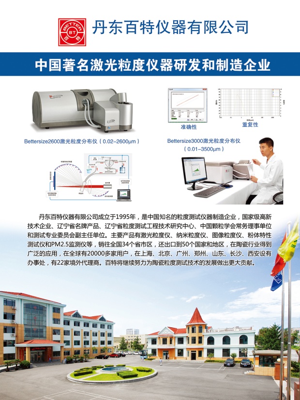 丹東百特儀器有限公司成立于1995年,是中國知名的粒度測試儀器制造企業(yè),國家級高新技術(shù)企業(yè)、遼寧省名牌產(chǎn)品、遼寧省粒度測試工程技術(shù)研究中心、中國顆粒學(xué)會常務(wù)理事單位和測試專業(yè)委員會副主任單位。主要產(chǎn)品有激光粒度儀、納米粒度儀、圖像粒度儀、粉體特性測試儀和PM2.5監(jiān)測儀等,銷往全國34個省市區(qū),還出口到50個國家和地區(qū),在陶瓷行業(yè)得到廣泛的應(yīng)用,在全球有20000多家用戶,在上海、北京、廣州、鄭州、山東、長沙、西安設(shè)有辦事處,有22家境外代理商。百特將繼續(xù)努力為陶瓷粒度測試技術(shù)的發(fā)展做出更大貢獻。