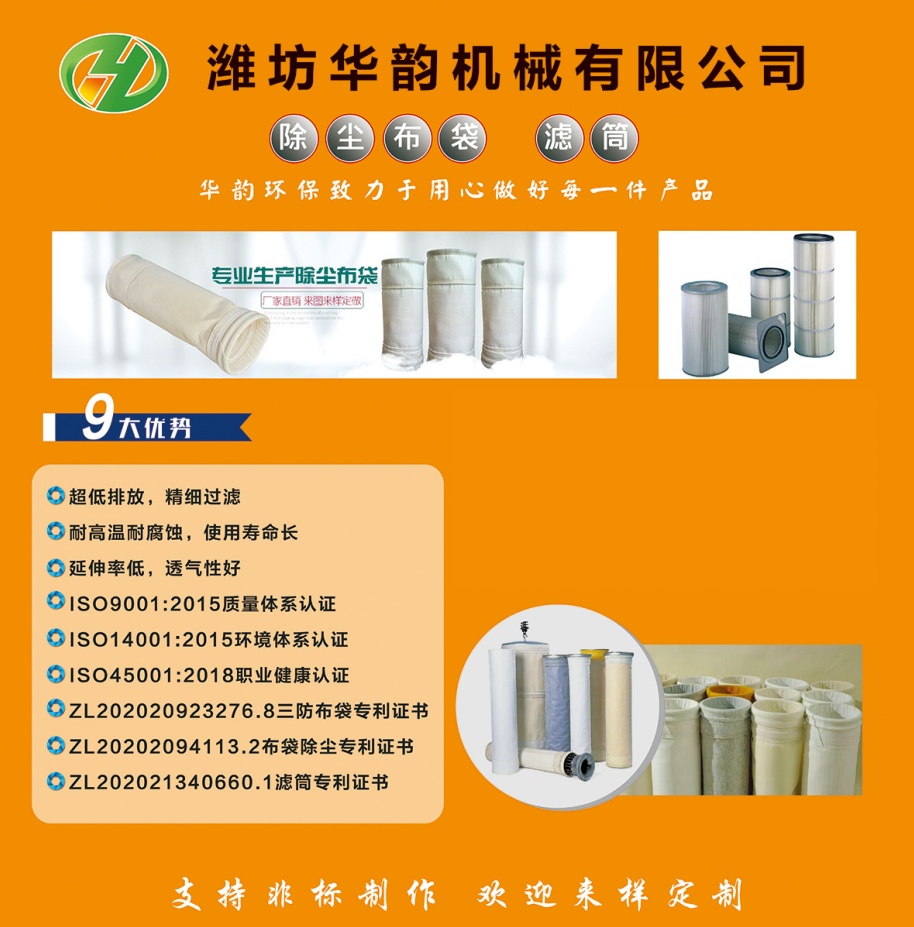 濰坊華韻機械有限公司是一家專業從事除塵布袋、除塵濾筒、除塵濾芯、除塵濾袋及布袋除塵器的生產、銷售、安裝為一體的專業化企業。為了確保產品的品質.公司在加工制作方面采用全自動縫紉生產線,確保縫紉質量。我們技術團隊有長期的行業從業經驗,擁有行業成熟的生產技術,確保滿足高品質的質量要求。公司生產的多種濾材的工業除塵濾筒,靜電噴涂粉末回收濾芯,以及除塵設備和涂裝設備中的其他配件。