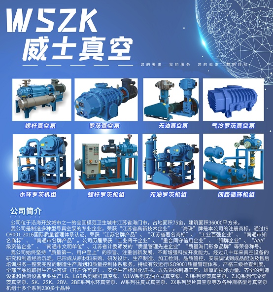 南通市威士真空設備有限公司位于沿海開放城市之一的全國模范衛生城市江蘇省海門市,占地面積65畝,建筑面積25000平方米。