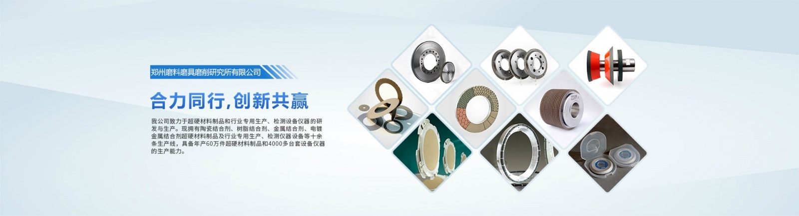 我公司致力于超硬材料制品和行業專用生產、檢測設備儀器的研發與生產。現擁有陶瓷結合劑、樹脂結合劑、金屬結合劑、電鍍金屬結合劑超硬材料制品及行業專用生產、檢測儀器設備等十余條生產線,具備年產60萬件超硬材料制品和4000多臺套設備儀器的生產能力。