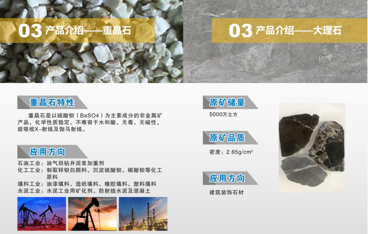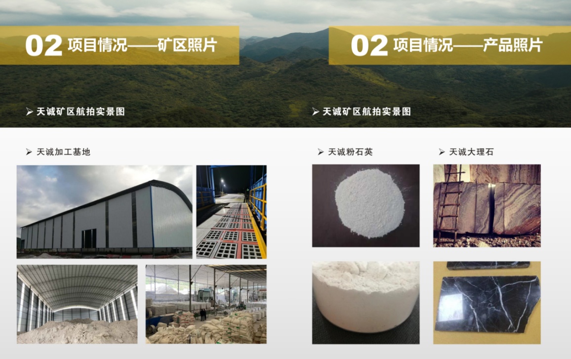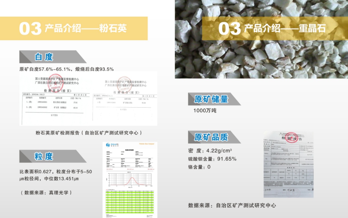 目前礦區將擴容至5平方公里,含7000萬噸粉石英,1000萬噸重晶石,5000萬立方大理石。同時,公司新材料加工基地己正式投入運營,基地規劃4個生產車間,其中一個作為粉石英材料加工基地。