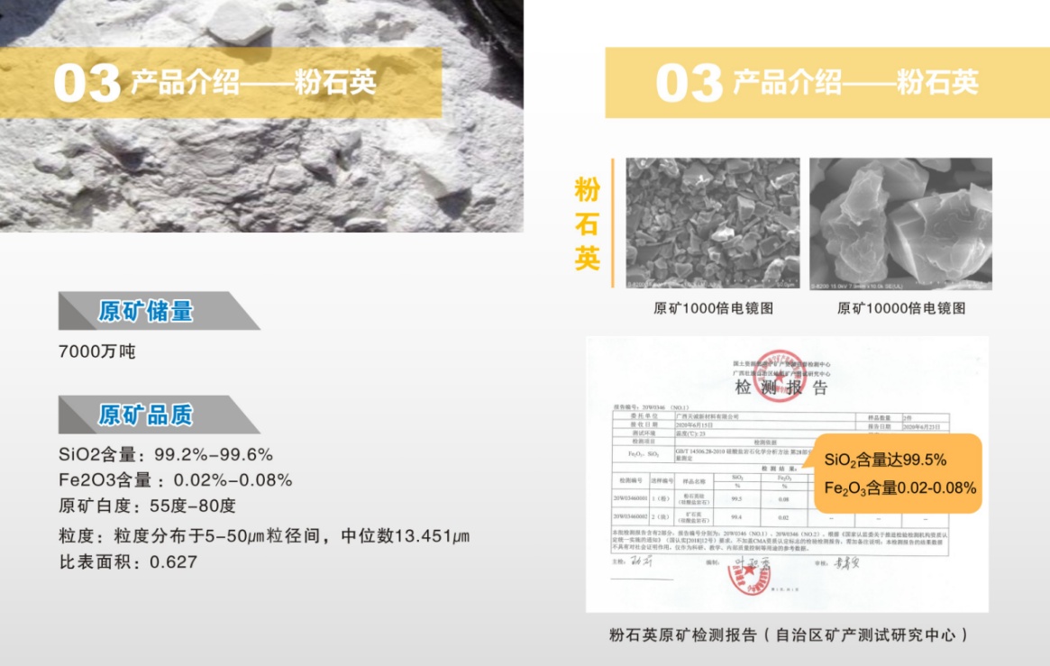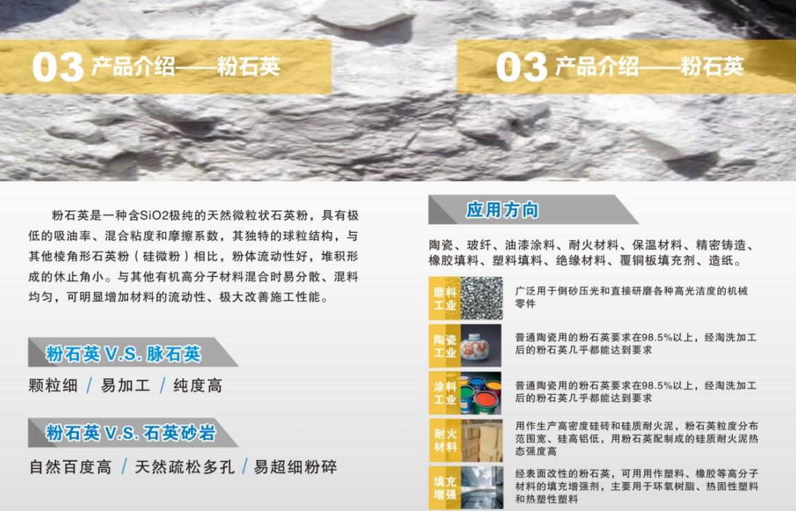 公司是一家專門從事粉石英開采及二氧化硅新材料精深加工的集研發、生產和銷售于一體的高新技術企業。公司擁有千萬噸級優質粉石英礦山一座,同時擁有占地面積100畝的硅基材料加工基地。