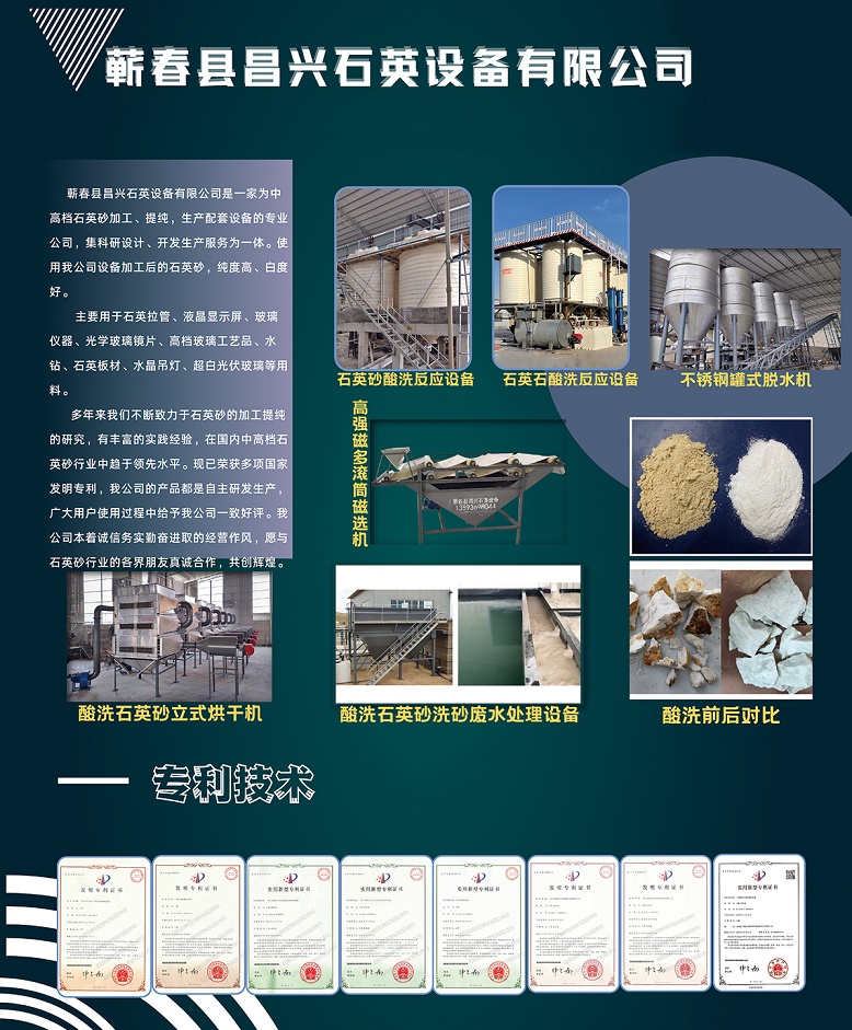蘄春縣昌興石英設備有限公司是一家為中高檔石英砂加工、提純,生產配套設備的專業公司,集科研設計、開發生產服務為一體。