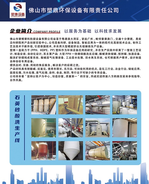 塑博一直致力于(PPH、HDPE、PP)塑料作為環(huán)保設(shè)備應(yīng)用的研究,并在生產(chǎn)實踐中積累了一整套工藝設(shè)計、制造安裝、自動化設(shè)計,其主要產(chǎn)品:大型PPH一體纏繞酸洗反應(yīng)罐,酸堿液體儲罐、攪拌罐、加溫設(shè)備酸洗礦砂提純成套系統(tǒng)、酸堿廢氣處理裝備、工業(yè)廢水處理、回水再生系統(tǒng),也可根據(jù)用戶需求,設(shè)計制造各種非標專用設(shè)備。