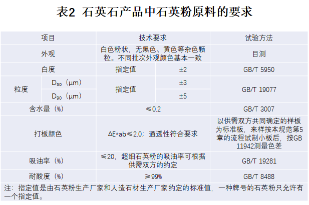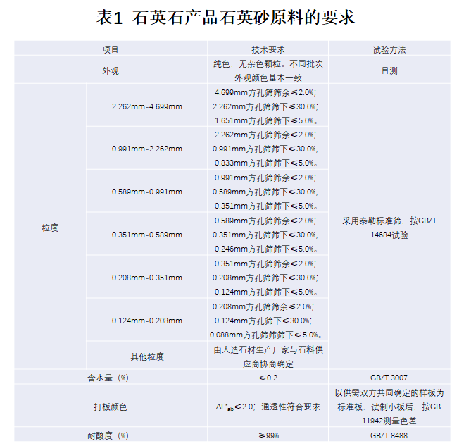 石英砂在人造石各類產品中主要應用在石英石產品中,這類產品目前主要在廚房和衛生間臺面板使用,具有強度高、耐磨、耐污染等特征,是高端產品的必需原料。一些低端的臺面板產品也選用了花崗巖、廢玻璃或廢瓷磚磨成的粒料或粉料,以滿足裝飾效果,但產品理化性能則大打折扣。石英石產品使用的石英砂要符合表1的要求,石英粉要符合表2的規定;