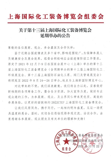關(guān)于第十三屆上海國際化工裝備博覽會延期舉辦的公告