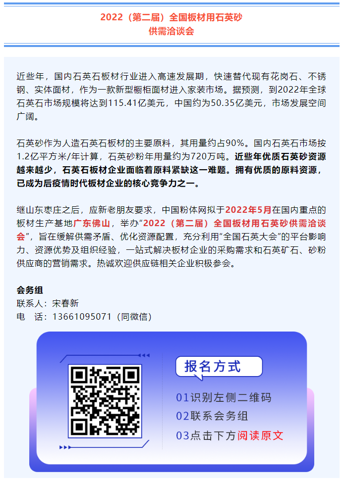 5月19號,“2022(第二屆)全國板材用石英砂供需洽談會”將在廣東·佛山南海保利皇冠假日酒店舉行,山東華特磁電邀您一同參加。