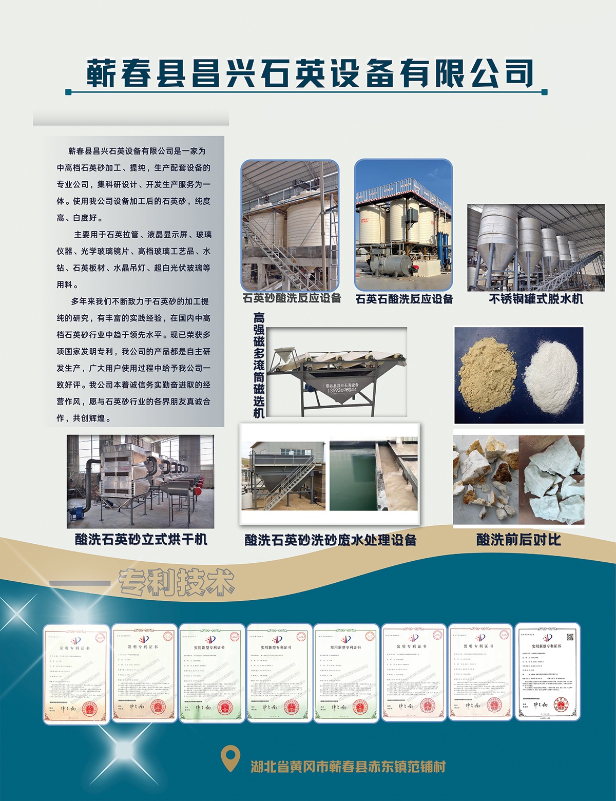 蘄春縣昌興石英設備有限公司是一家為中高檔石英砂加工、提純,生產配套設備的專業公司,集科研設計、開發生產服務為一體。