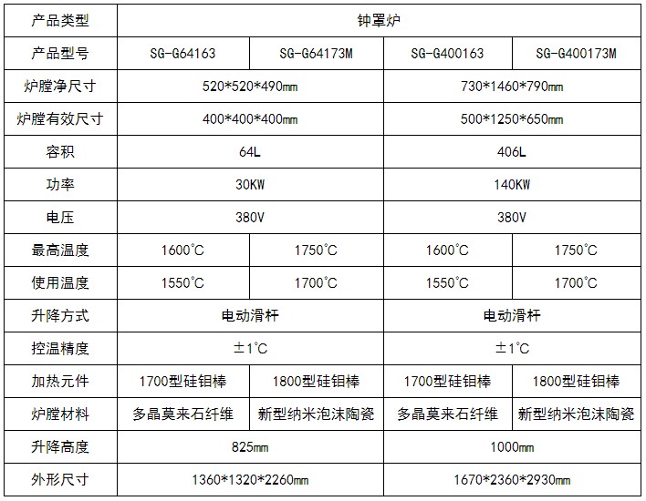 鐘罩爐為周期性作業高溫燒結爐,設計應用于電子陶瓷、氧化鋯陶瓷、 氧化鋁陶瓷、介質陶瓷、磁性材料、納米材料等的高溫燒結生產,以及特種陶瓷靶材產品的預燒和燒結處理,高純石英、 藍寶石等退火工藝。該電爐爐膛采用多晶莫來石纖維/優質新工藝納米陶瓷泡沫纖維材料拼接而成,潔凈度高,耐腐蝕,采用優質硅鉬棒作為加熱元件,四面加熱腔,溫場均勻,電動升降機構,底座穩固。該設備操作簡便, 控溫穩定、 溫度均勻性好、 高效節能等特點,適用于高校、科研院所實驗和企業批量生產。