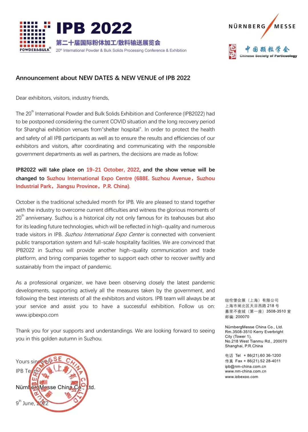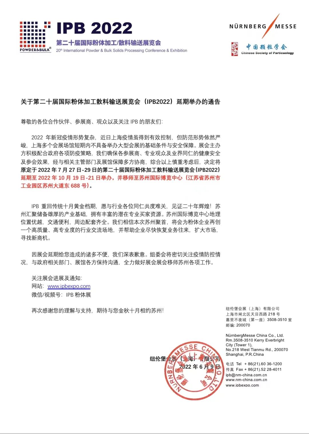 尊敬的各位合作伙伴、參展商、觀眾以及 關注IPB的朋友們: 2022年新冠疫情形勢復雜,近日上海疫情雖得到有效控制,但防范形勢依然嚴峻,上海多個會展場館短期內不具備舉辦大型會展的基礎條件與安全保障。展會主辦方積極配合政府各項防疫策略,我們確保各參展商、專業觀眾及業界同仁的健康安全及參會效果,經與相關主管部門及展館保障多方協商,綜合以上慎重考慮后,決定將原定于2022年7月27日-29日的第二十屆國際粉體加工散料輸送展覽會(IPB2022)延期至2022年10月19日-21日舉辦,并移師至蘇州國際博覽中心(江蘇省蘇州市工業園區蘇州大道東688號)。 IPB重回傳統十月黃金檔期,愿與行業各位同仁共度難關,見證二十年輝煌!蘇州匯聚儲備雄厚的產業基礎,擁有豐富的潛在專業買家資源。蘇州國際博覽中心地理位置優越,交通便利,周邊配套齊全。我們相信本次蘇州聚首,將會為粉體企業再創一個高質量、高專業度的行業交流場地,并幫助企業盡快恢復業務往來,擴大市場,尋找新商機。 因展會延期給您造成的諸多不便,我們深表歉意。組委會將密切關注疫情防控情況,與政府相關部門、展館各方保持溝通,全力做好展會移師蘇州各項工作。 關注展會進展及通知: 網站:www.ipbexpo.com 微信/視頻號:IPB粉體展 再次感謝您的理解與支持,期待與您金秋十月相約蘇州! 紐倫堡會展(上海)有限公司 2022年6月9日