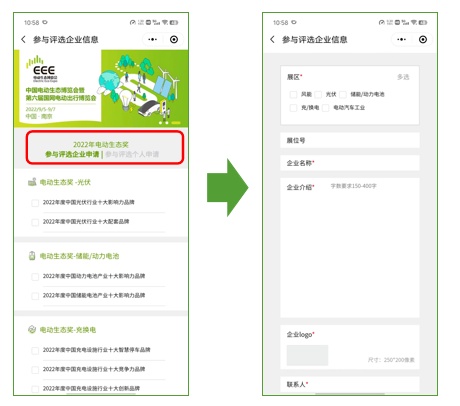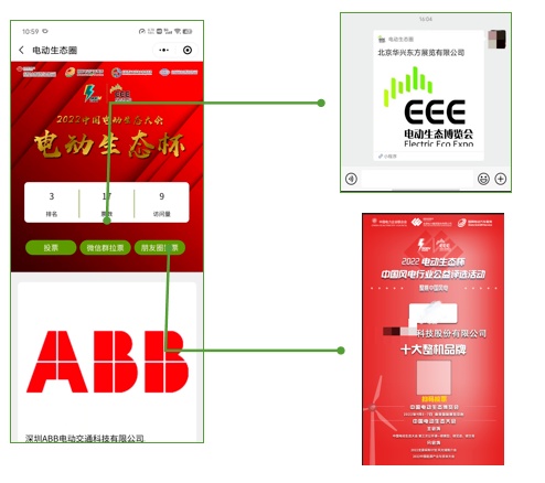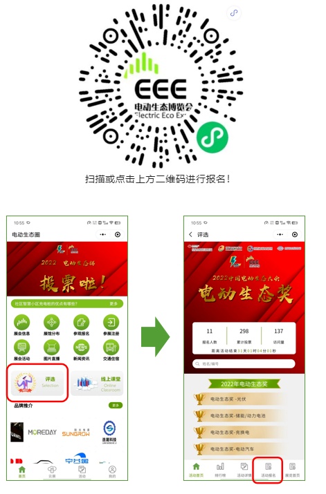 【投票規(guī)則】 1、投票活動(dòng)時(shí)間,6月27日9:00截止到2022年7月29日晚上12點(diǎn); 2、根據(jù)企業(yè)/個(gè)人投票票數(shù)和媒體評委團(tuán)評選,共同評選出各版塊獲獎(jiǎng); 3、投票計(jì)數(shù),每人每日可給各參選企業(yè)投票10次; 4、評選秉承公開公平公正的原則,杜絕線上刷票,一經(jīng)發(fā)現(xiàn)取消評選資格; 【評選流程】 1、報(bào)名:評選報(bào)名采取企業(yè)自愿原則,免費(fèi)報(bào)名,參選企業(yè)必須是充換電基礎(chǔ)設(shè)施及配套企業(yè); 2、投票:各申報(bào)企業(yè)拉動(dòng)團(tuán)隊(duì)進(jìn)行報(bào)名,按照投票排名先后決定入圍企業(yè)范圍; 3、入圍:評審委員會(huì)收到報(bào)名企業(yè)資料后進(jìn)行核實(shí),初步篩選入圍名單; 4、初評:按各獎(jiǎng)項(xiàng)類別根據(jù)企業(yè)上報(bào)產(chǎn)品進(jìn)行評估篩選; 5、終評:評委會(huì)成員投票打分,并綜合網(wǎng)絡(luò)投票數(shù)額產(chǎn)生最終評審結(jié)果; 【操作流程】 1、微信小程序中搜索“電動(dòng)生態(tài)圈”小程序端,或識別二維碼進(jìn)入小程序;