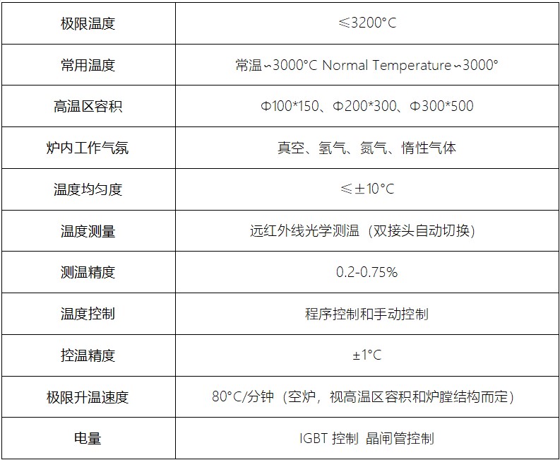 達到極限溫度3200°C,常用溫度3000°C的高溫爐體,滿足各種材料的燒結和石墨化處理。