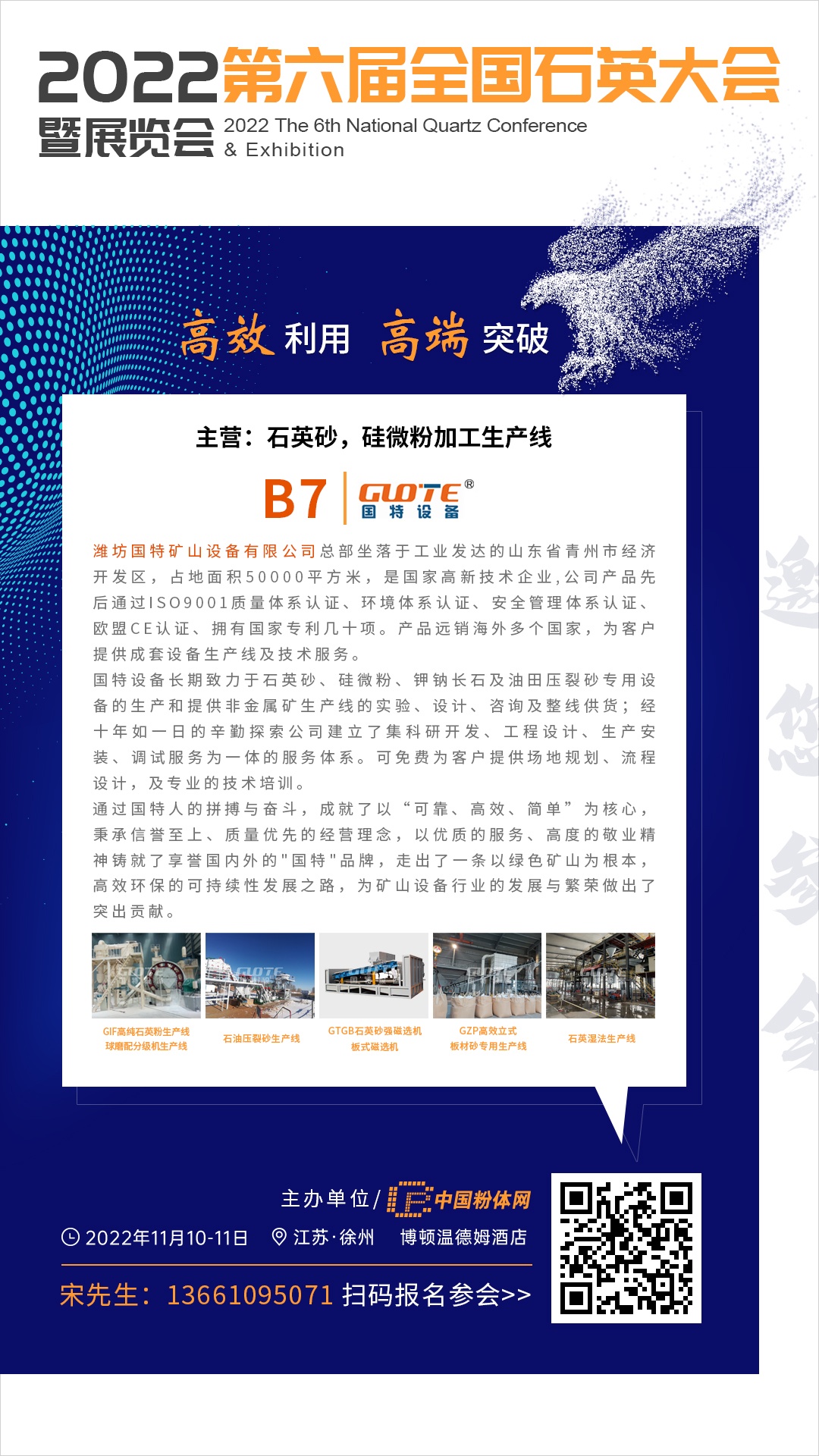 由中國(guó)粉體網(wǎng)主辦的“2022(第六屆)全國(guó)石英大會(huì)”將于11月10-11日在江蘇·徐州舉辦,濰坊國(guó)特邀您一同參加。