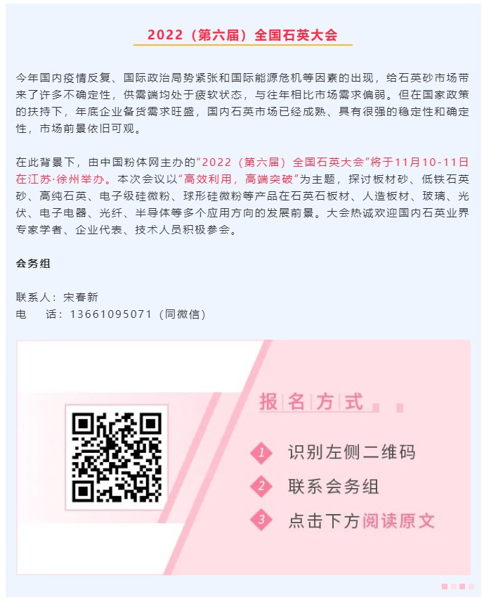 由中國(guó)粉體網(wǎng)主辦的“2022(第六屆)全國(guó)石英大會(huì)”將于11月10-11日在江蘇·徐州舉辦,江蘇安必信您一同參加。