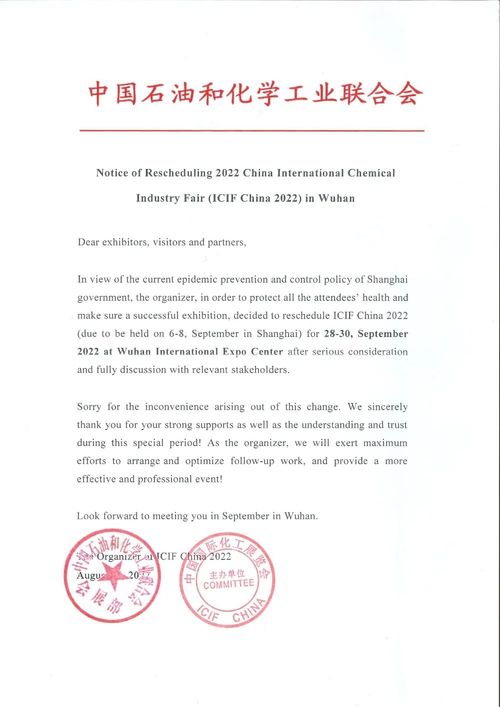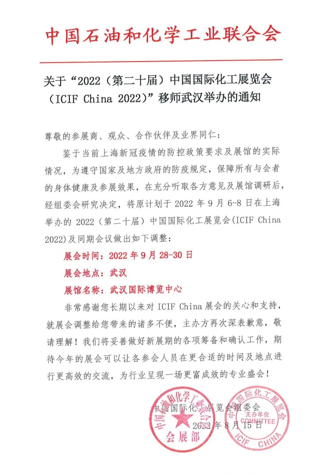 關于“2022(第二十屆)中國國際化工展覽會(ICIF China 2022)”移師武漢舉辦的通知