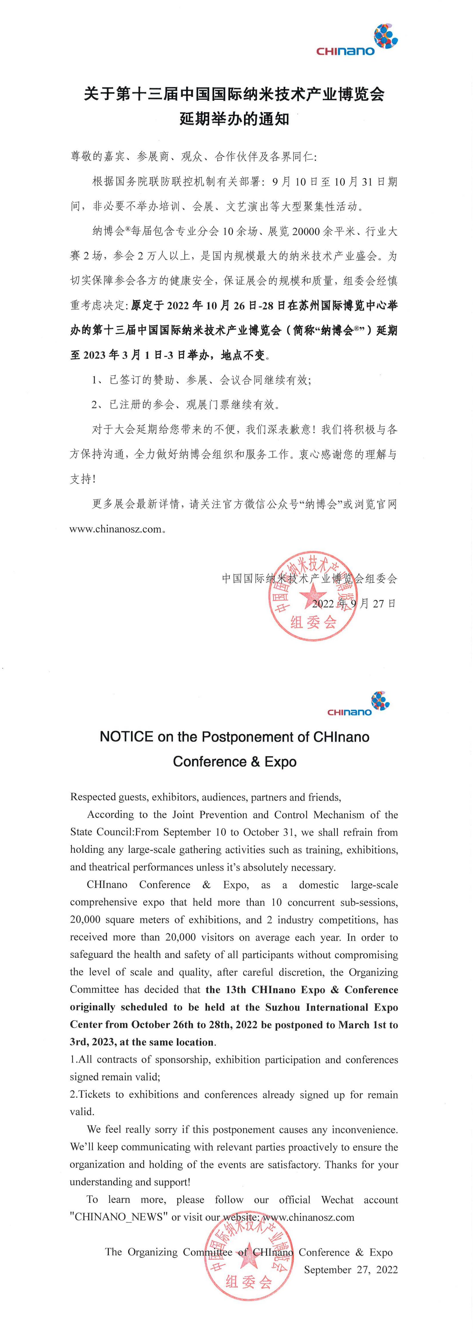 關(guān)于第十三屆中國國際納米技術(shù)產(chǎn)業(yè)博覽會延期舉辦的通知