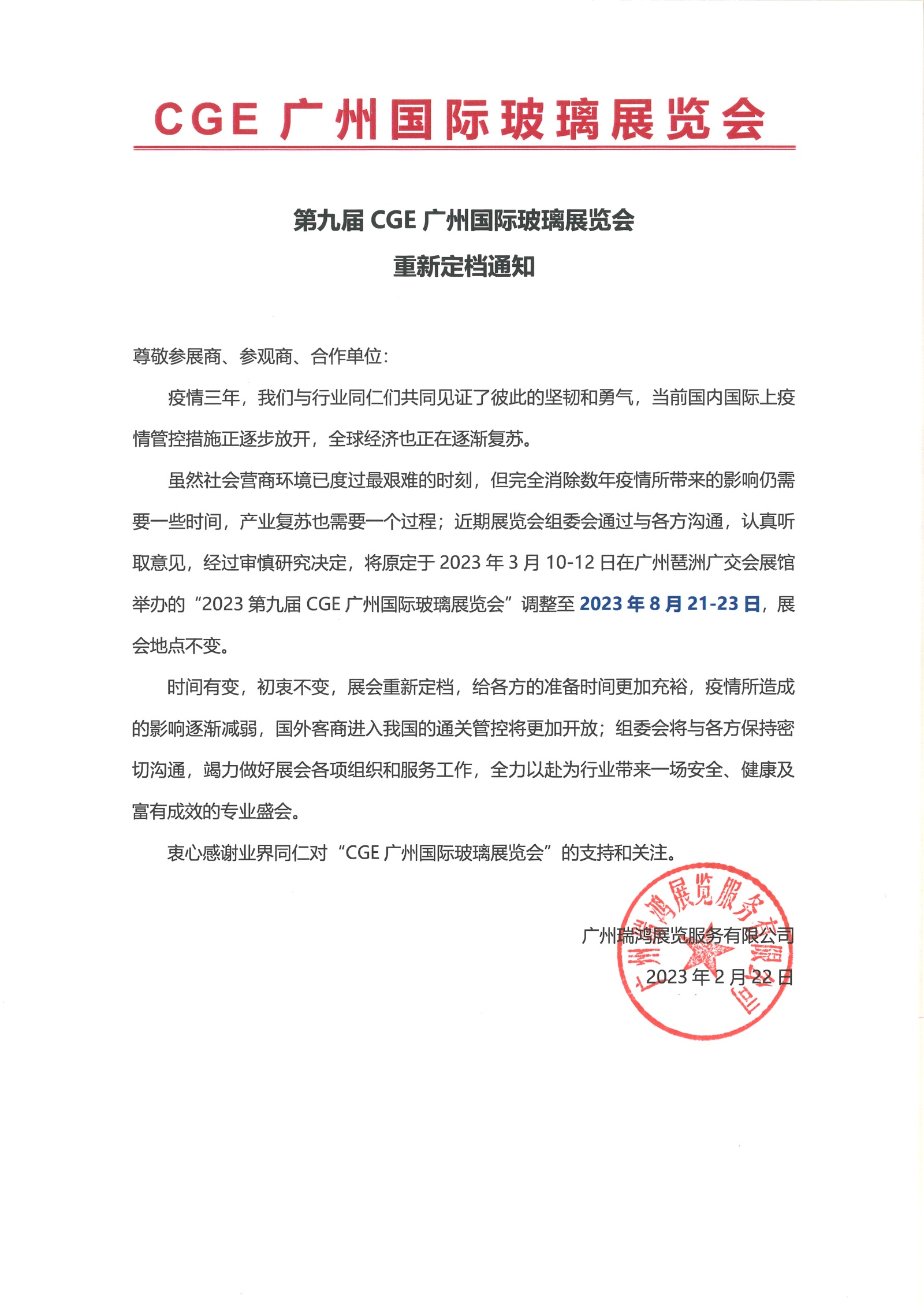 第九屆CGE廣州國際玻璃展覽會重新定檔通知