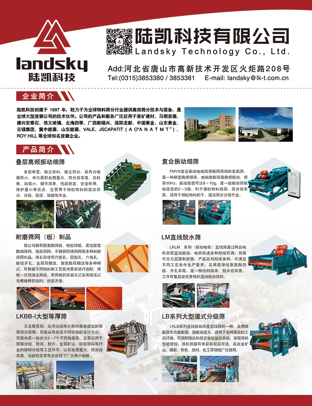 陸凱科技創建于1997年,位于河北省唐山市高新技術產業園區,長期專注于高效篩分技術及裝備研發制造。