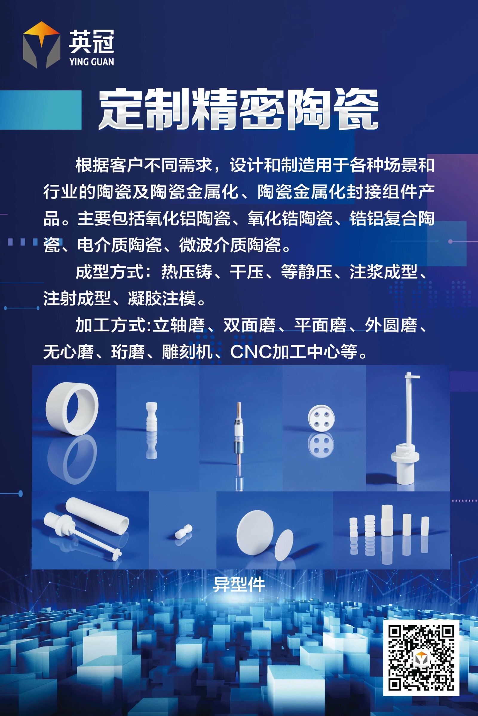 英冠陶瓷多年來深耕特種陶瓷行業(yè),積累了豐富的研發(fā)、生產(chǎn)實踐經(jīng)驗,培育了一支精干的人才隊伍,具有干壓、等靜壓、熱壓鑄、凝膠注模等成熟工藝,擁有高溫隧道燒結窯爐七座,精密陶瓷加工設備150余臺,高溫陶瓷厚膜金屬化、磁控濺射薄膜金屬化的大規(guī)模生產(chǎn)能力。是國家高新技術企業(yè),具有多項發(fā)明及實用新型專利。