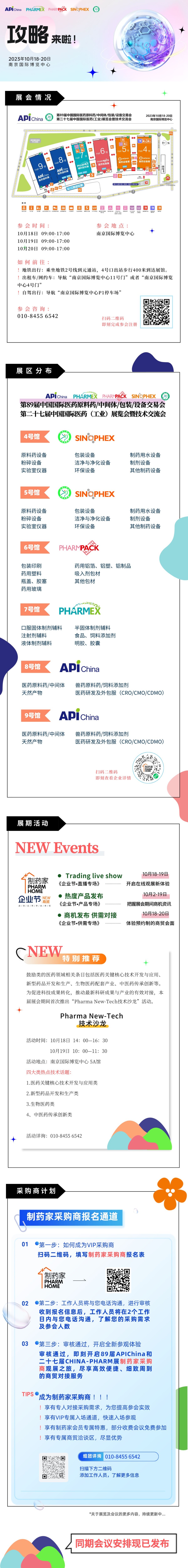 第89屆中國醫藥原料藥/中間體/包裝/設備交易會(API China)、第二十七屆中國國際醫藥(工業)展覽會暨技術交流會(CHINAPHARM)將于10月18-20日在南京國際博覽中心舉辦。 第89屆API China & 第二十七屆CHINA-PHARM將攜手1200余家醫藥原料藥、中間體、藥用輔料、醫藥包裝、制藥設備企業,與超過6萬名來自全球藥品、保健品與化妝品領域專注研發與生產的行業同仁將匯聚南京,分享大健康產業蓬勃發展帶來的巨大市場機遇,為中國制藥工業企業搭建覆蓋藥品研發與生產全生命周期、全產業鏈的交流與合作的展示平臺,全面展示最新產品、技術、設備及解決方案,傳播先進制藥理念,以創新推動產業升級,塑造中國制藥工業發展新優勢。與制藥行業同仁共同打造一條韌性強、安全高,不斷變長變寬的產業鏈。 丹桂飄香,華章再啟 從南京出發,共同構建新時代中國制藥工業合作發展交流的新格局。 89屆API China & 27屆CHINA-PHARM 10月18-20日 南京見! 參會攻略 第一期