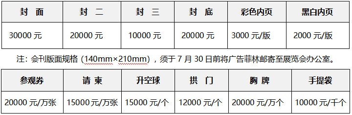 國內(nèi)企業(yè):標(biāo)準(zhǔn)展位,¥12800元/個;雙開口展位,¥13800元/個;國外企業(yè),$3800美元/個。