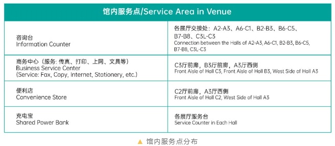 商務中心將提供傳真、打印、上網、文具等辦公服務;共享充電寶可隨時在各展廳服務臺租用;如有更多需求,請前往各咨詢臺尋求幫助。