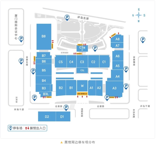 廈門國際會展中心位于廈門島東部,距廈門高崎國際機場14公里,廈門站8.7公里,廈門北站27.9公里。抵達廈門后,您可乘坐免費接駁車、公共交通(公交車、BRT快速公交、地鐵)、出租車或自駕到達展館,展館周邊設有若干臨時停車場,如您自駕前來請留意路邊指示牌。