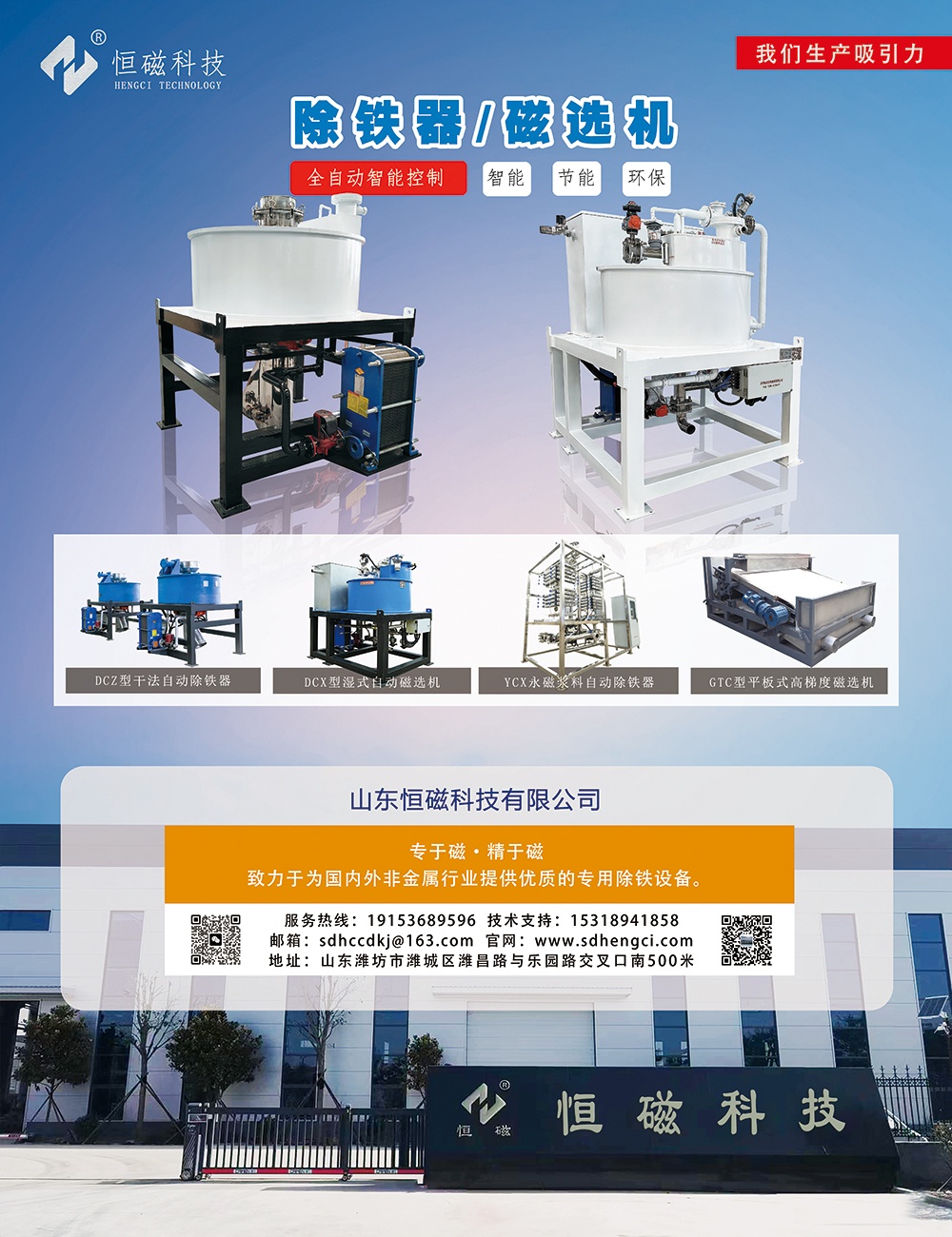 山東恒磁科技有限公司是國內外較早的一家專業磁選除鐵設備研發生產的磁選機廠家,公司主營產品:磁選機、干式磁選機、濕式磁選機、小型磁選機、高梯度磁選機、筒式磁選機、高嶺土磁選機、石英砂磁選機、鉀長石磁選機、非金屬磁選機、金屬磁選機以及單傳動高壓輥磨機等,公司擁有專業的技術人才和磁選研究技術專家,公司秉承現代企業的科學管理模式、精工制造、銳意進取、開拓創新,是一家現代化的綜合科研開發、生產制造、調試服務為一體的公司,山東恒磁科技始終向客戶提供滿意的產品和快捷完善的服務。