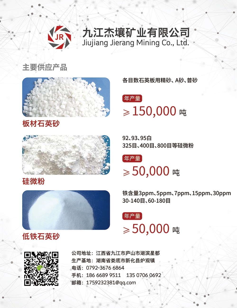 九江杰壤礦業有限公司集石英礦開采、深加工、銷售一體,主導產品為板材石英砂、硅微粉、低鐵石英砂、高純石英砂,年生產銷售量超過二十萬噸。