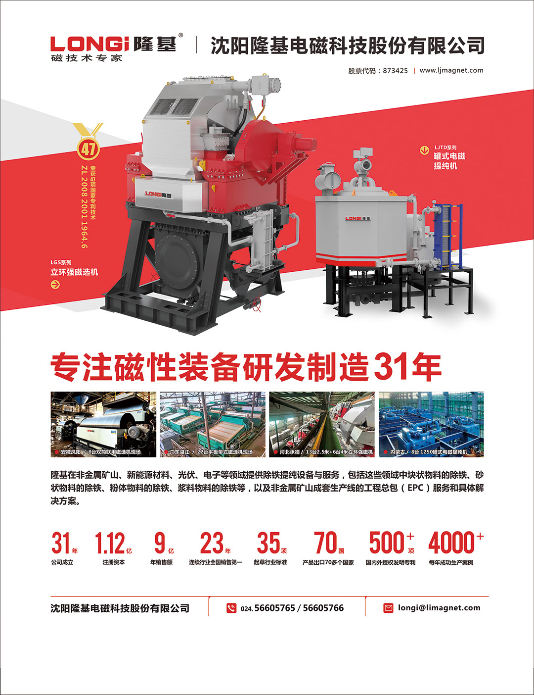 沈陽隆基電磁科技股份有限公司(前身撫順磁電實業公司)成立于1993年,專注于磁性裝備制造,是國家級高新技術企業,國家標準、行業標準起草單位,擁有450余項專利和多項創造性技術成果,設有機械工業磁選工程技術研究中心、遼寧省省級企業技術中心,先后獲得第十九屆中國專利優秀獎、工信部專精特新“小巨人”企業、遼寧省專精特新“小巨人”企業等榮譽稱號。