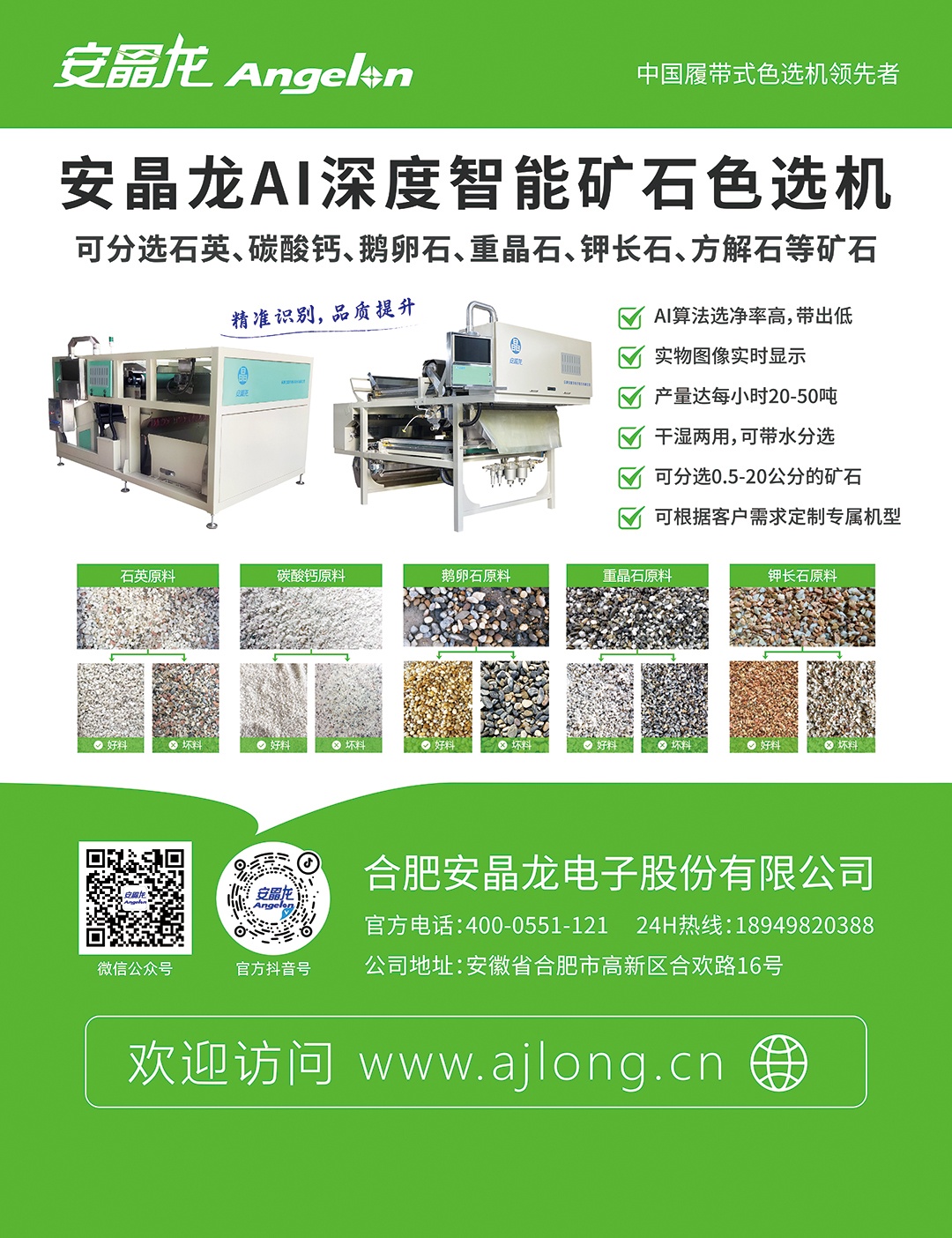 公司自主研發生產的“安晶龍”牌(Angelon)履帶式智能彩色色選機已成為國內技術的領先者。廣泛運用于礦石資源、食品、中藥材、再生資源等眾多領域,色選效果也遠超國內外同類產品。安晶龍履帶式色選機銷往全世界30多個國家和地區,受到國內外客戶的青睞。