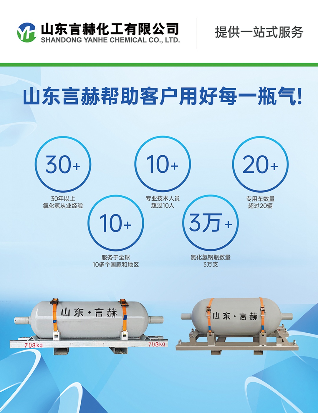 山東言赫化工有限公司是一家主要從事氯化氫氣體服務商,公司自有多位氯化氫氣體專業從業人員,幾十年如一日,一直堅持在氯化氫事業奮斗之路上。