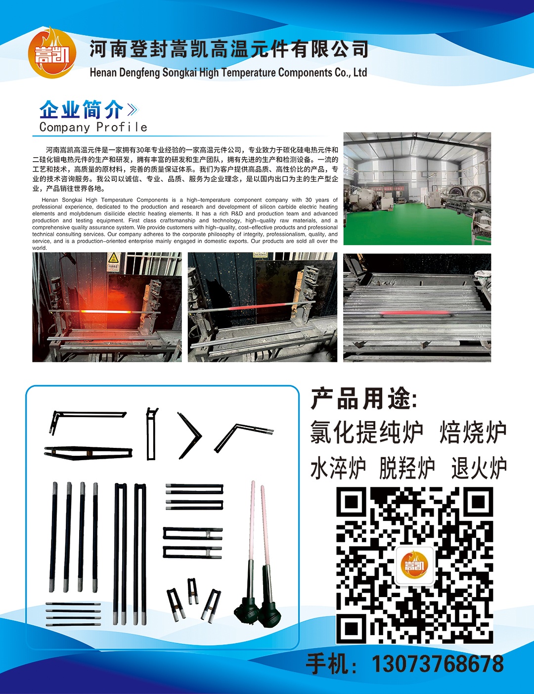 河南嵩凱高溫元件是一家擁有30年專業(yè)經(jīng)驗(yàn)的一家高元件公司,專業(yè)致力于碳化硅電熱元件和二硅化鉬電熱元件的生產(chǎn)和研發(fā),擁有豐富的研發(fā)和生產(chǎn)團(tuán)隊(duì),擁有先進(jìn)的生產(chǎn)和檢測(cè)設(shè)備。一流的工藝和技術(shù),高質(zhì)量的原材料,完善的質(zhì)量保證體系。我們?yōu)榭蛻籼峁└咂焚|(zhì)、高性價(jià)比的產(chǎn)品,專業(yè)的技術(shù)咨詢服旁。我公司以誠信、專業(yè)、品質(zhì)、股務(wù)為企業(yè)理念,是以國內(nèi)出口為主的生產(chǎn)型企業(yè),產(chǎn)品銷往世界各地。