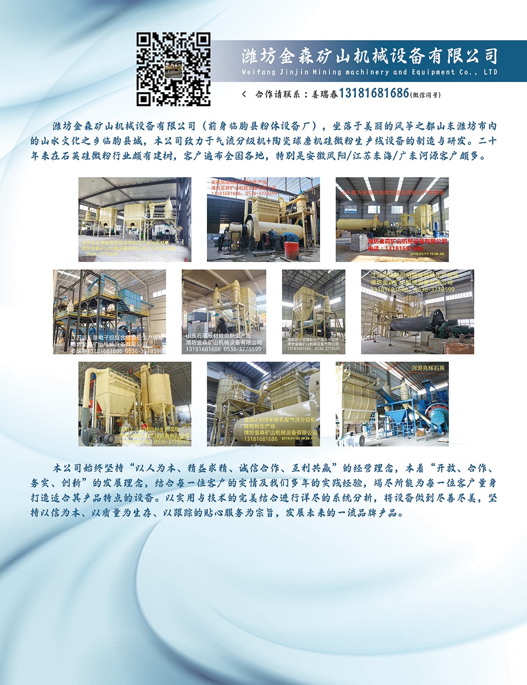 濰坊金森礦山機械設備有限公司,坐落于美麗的風箏之都山東濰坊市內的山水文化之鄉臨朐縣城,公司創立已十年有余,具有二十多年生產實踐經驗的高級工程師3人。本公司致力于非金屬礦產品的加工設備及其附屬設備和配件為主的生產加工型企業。是集科研開發、工程設計、生產按裝、調試服務與一體的非金屬礦加工設備生產企業。經多年的風雨磨礪,積累了豐富的經驗,為石英硅微粉、高溫a-氧化鋁粉、高嶺土、重晶石、石墨、莫來石、碳化硅等非金屬礦物粉體加工及其它材料的破碎、除鐵、烘干、研磨、分級、輸送、包裝等工序提供了優良的服務,并提供球磨+氣流分級機微粉生產線及烘干、破碎、包裝設備成套生產線設計制作按裝及非金屬礦加工工程技術咨詢。