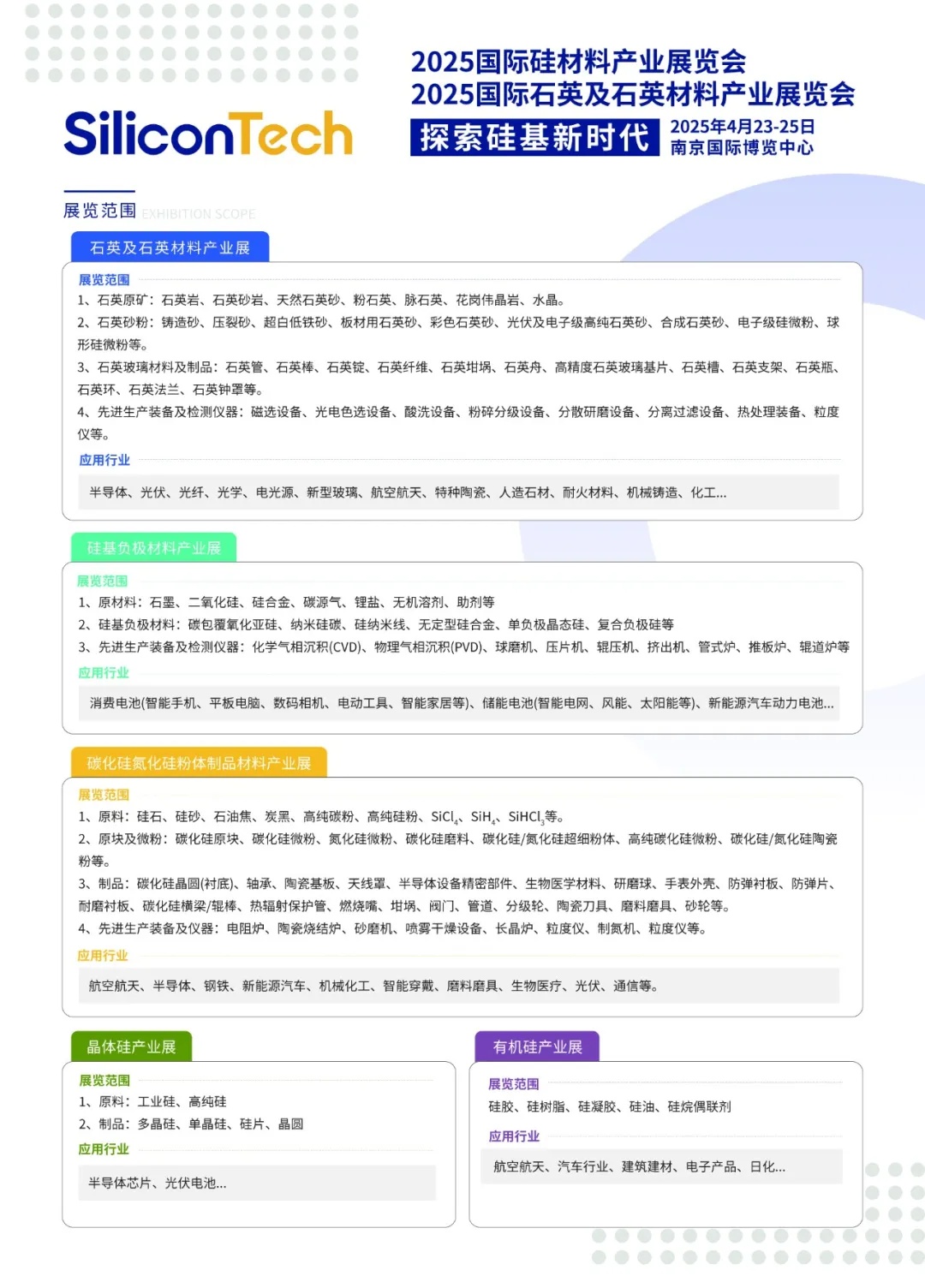 SiliconTech2025國際硅材料產業展覽會將以“國際化、權威化、專業化”為展覽核心,集中展示石英及石英材料、硅基負極材料、碳化硅氮化硅粉體制品材料、晶體硅和有機硅,匯集行業知名專家教授、業界龍頭企業、技術專家與企業高管共同參與,是一年一度共同探索硅基新時代極具影響力的盛會!