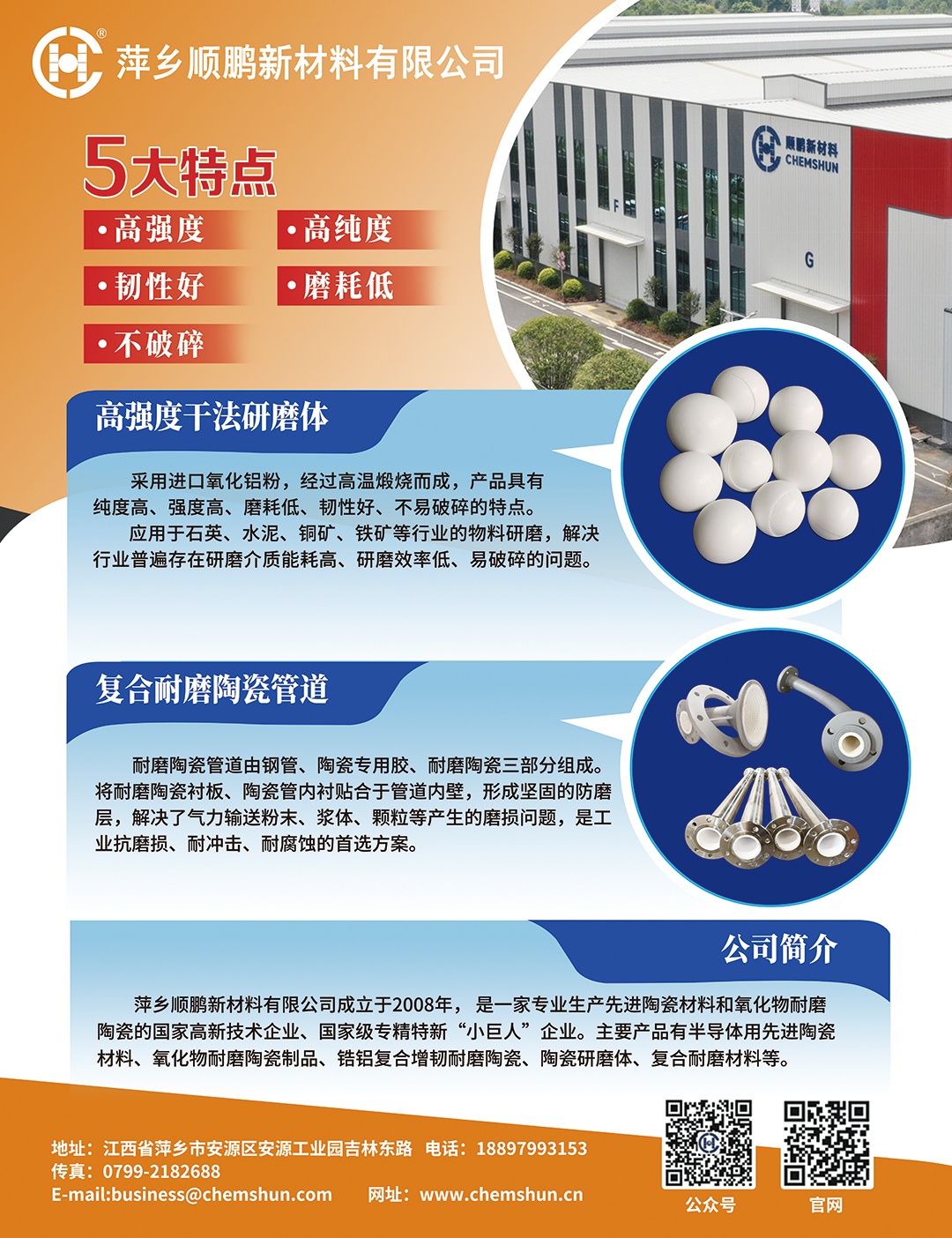 萍鄉順鵬新材料有限公司成立于2008年,位于萍鄉市安源區安源工業園,是一家專業生產耐磨新材料的國家高新技術企業、國家級專精特新小巨人企業,產品銷往全球60多個國家和地區。現有全資子公司萍鄉順鵬工程技術有限公司、萍鄉市置順陶瓷有限公司,控股公司江西中科特瓷新材料有限公司。