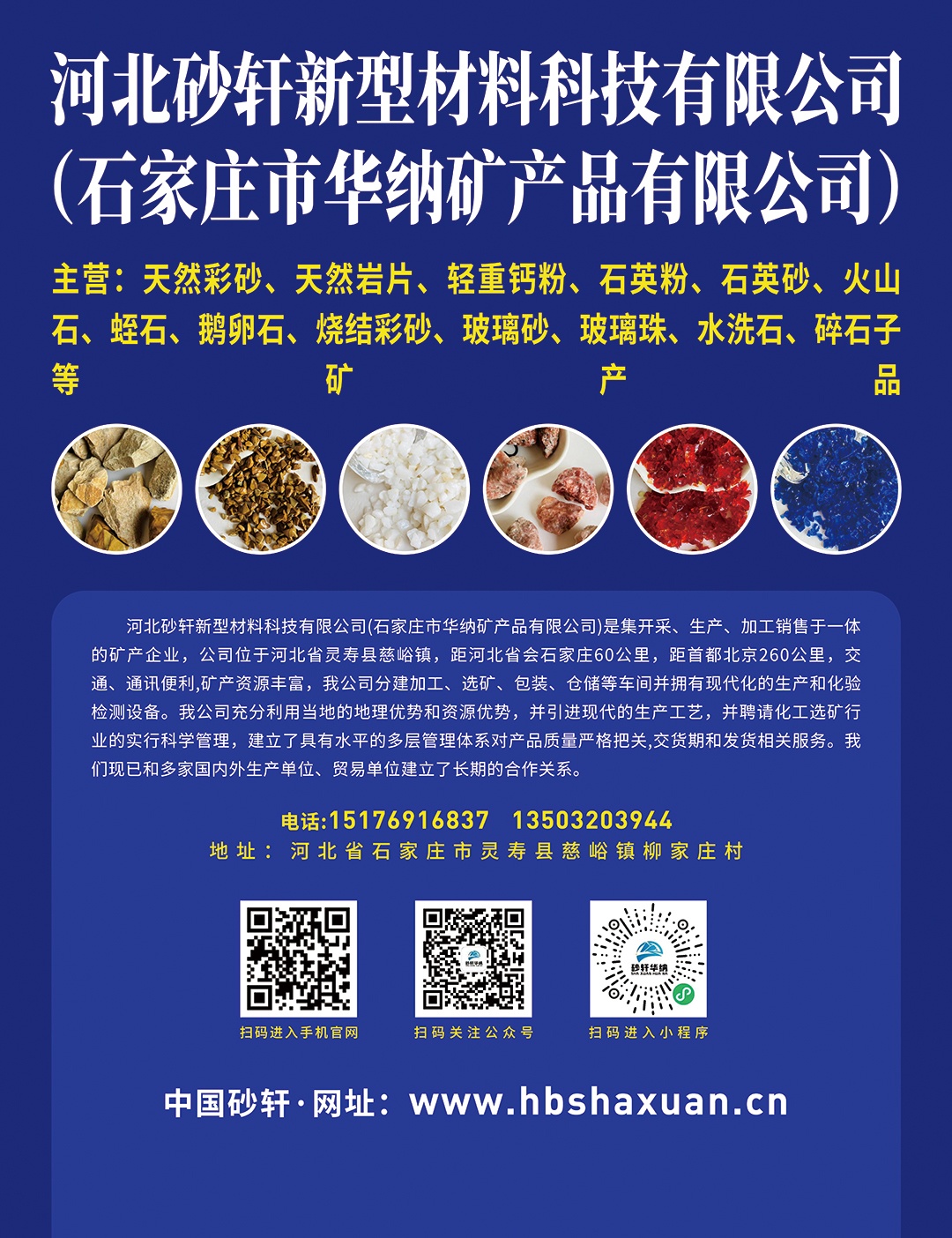 河北砂軒新型材料科技有限公司建于2017年,主要生產加工銷售天然彩砂、天然巖片、石英砂、蛭石、鵝卵石、金剛砂、碎石子、水洗石、火山石、重質碳酸鈣、輕質碳酸鈣、玻璃砂、玻璃珠、大塊碎玻璃、滑石粉、沸石粉、長石、重晶石、漂珠、珍珠巖、螢石粉、電氣石、海泡石、高嶺土、膨潤土、麥飯石、鋁礬土、硅藻土、石墨石等礦產品的加工銷售于一體礦產公司。