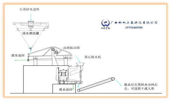 石英砂用渣漿泵抽到高頻振動篩初脫水(脫酸),石英砂含水量在15-30%,進入離心固液分離機,在離心力及雙質體振動力的共同作用下,石英砂進一步脫水(脫酸),脫水(脫酸)后石英砂含濕率6-9%;返回液回流到收集池,含濕率6-9%的石英砂,根據要求可進入下一工序處理。