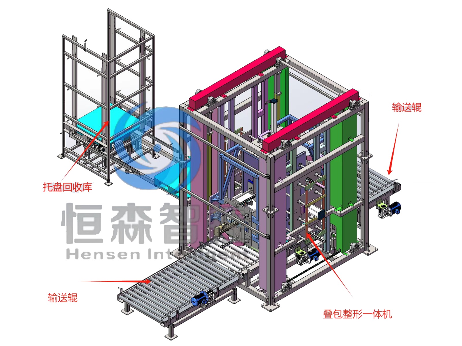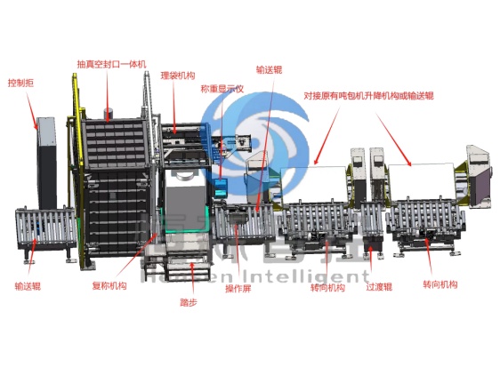 全自動噸袋疊包整形一體機可與抽真空機、穿箭打包機、纏膜機等銜接,自動完成