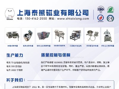 中國粉體網于2024年3月29日在安徽蕪湖舉辦“第二屆光伏行業用石英砂技術與市場交流大會”,泰熊磁業邀您一同參加。展位號:D21公司介紹上海泰熊磁業有限公司是專業從事磁性材料的研發、生產、加工、銷售為