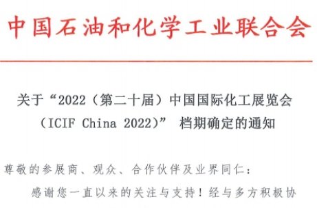 關于“2022(第二十屆)中國國際化工展覽會(ICIF China 2022)” 檔期確定的通知尊敬的參展商、觀眾、合作伙伴及業界同仁:感謝您一直以來的關注與支持!經與多方積極協調并充分聽取各方意見后