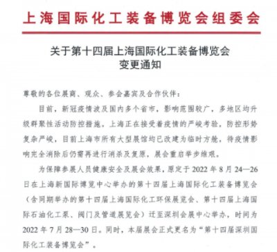 關于第十四屆上海國際化工裝備博覽會變更通知