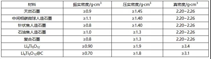 對于負極材料,密度會直接影響到電池的體積能量密度。對于同一種材料,其壓實密度越大,體積能量密度也越高,因此標準中對各項密度的下限值均做出了要求。